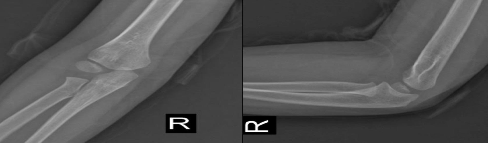 A 9-day-old term neonate, born via uncomplicated vaginal delivery, presented with restricted movement of the right upper limb. Although discharged without issues per medical records, the parents reported symptom onset from birth. Examination revealed elbow swelling, tenderness, and reduced ROM, with intact neurovascular status and a preserved posterior elbow triangle. Laboratory tests showed no infection. Anteroposterior (AP) and lateral radiographs (Figure 1) demonstrated posteromedial displacement of the radio-ulnar complex, consistent with a Salter-Harris type I distal humerus physeal separation. Due to delayed presentation, closed reduction was not attempted, and the elbow was immobilized with a splint. One week later, radiographs showed early callus formation (Figure 2).