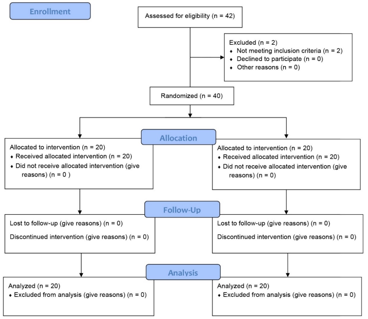 The sample size was calculated based on the study performed by Patel et al. (2015) with 95% confidence and 80% power, resulting in 17 participants per group. Accounting for a potential 20% dropout rate, a total of 20 participants per group were considered.