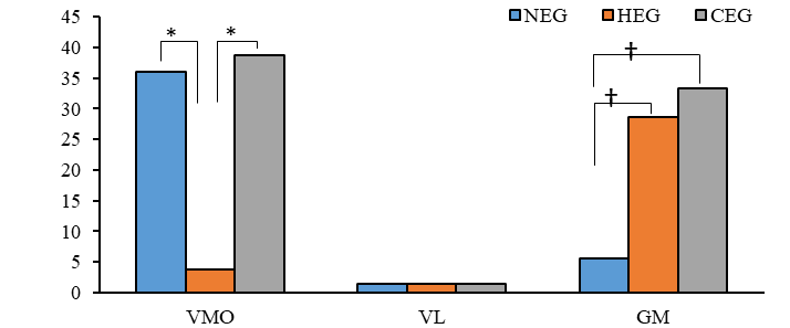 Analysis of percentage changes in muscle activity from pre- to post-intervention revealed clear patterns (Figure 2). A one-way ANOVA showed that the most significant improvements in VMO activation occurred in CEG (38.7% increase) and KEG (36.1% increase), both of which significantly exceeded the improvement seen in HEG (3.7% increase) (p < 0.01).